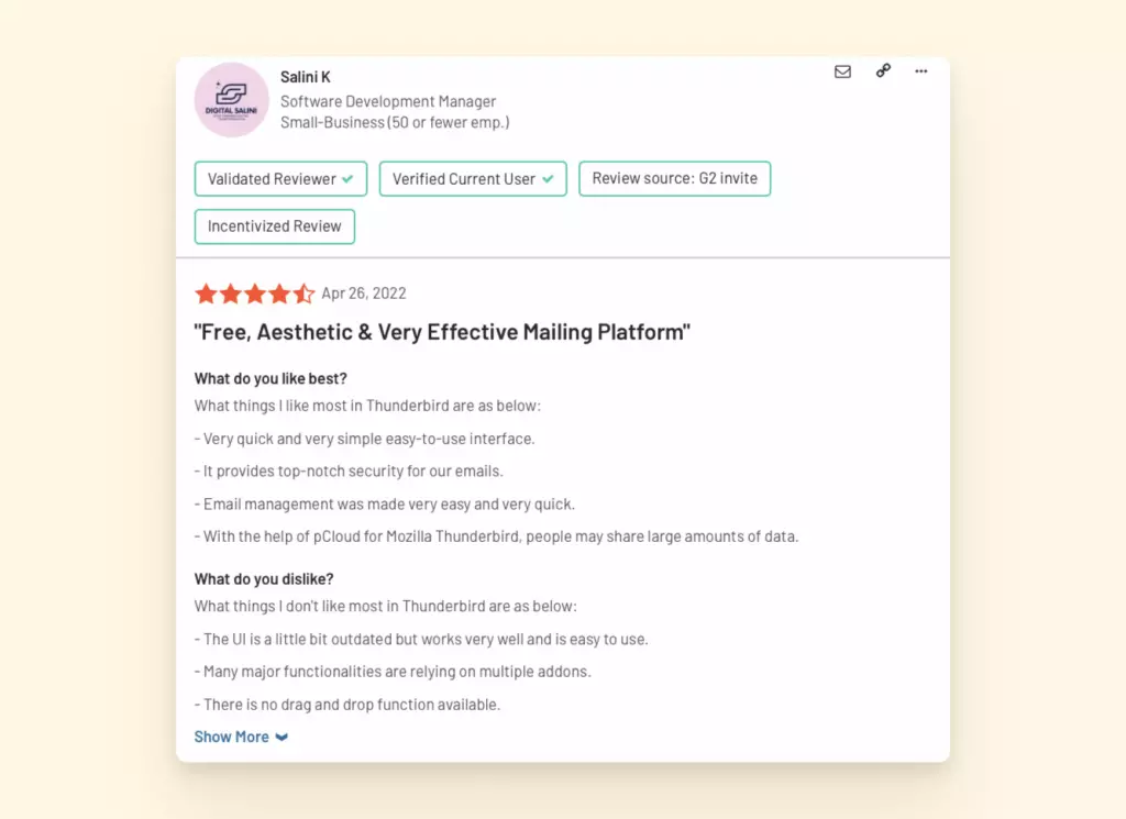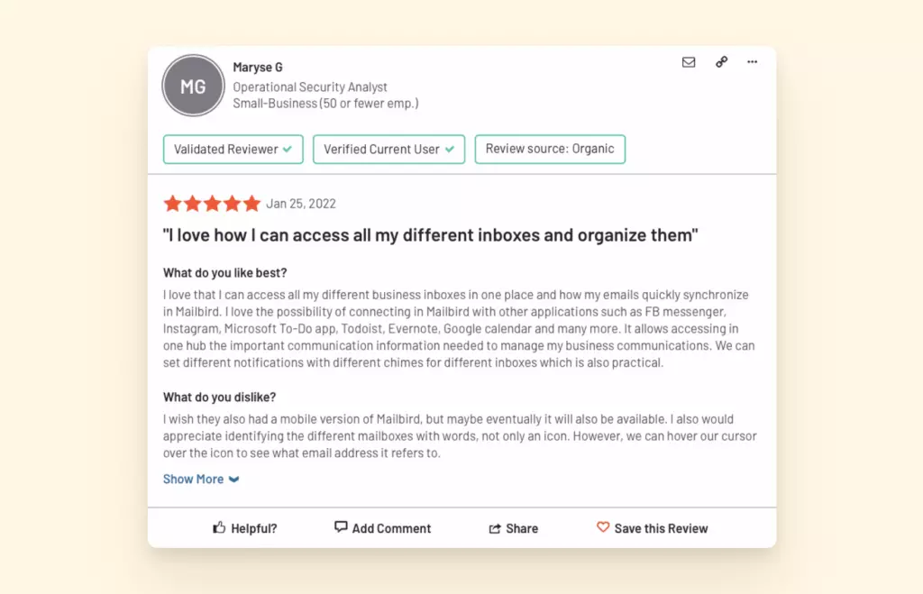 - Recursos de produtividade. A lista de recursos de produtividade no Mailbird é extensa. Você pode acessar respostas em linha, leitor rápido, snooze de e-mail, lembretes de anexos, arrastar e soltar anexos, identidades, barra de ação rápida, botão de cancelamento de inscrição, pastas e muitos mais.